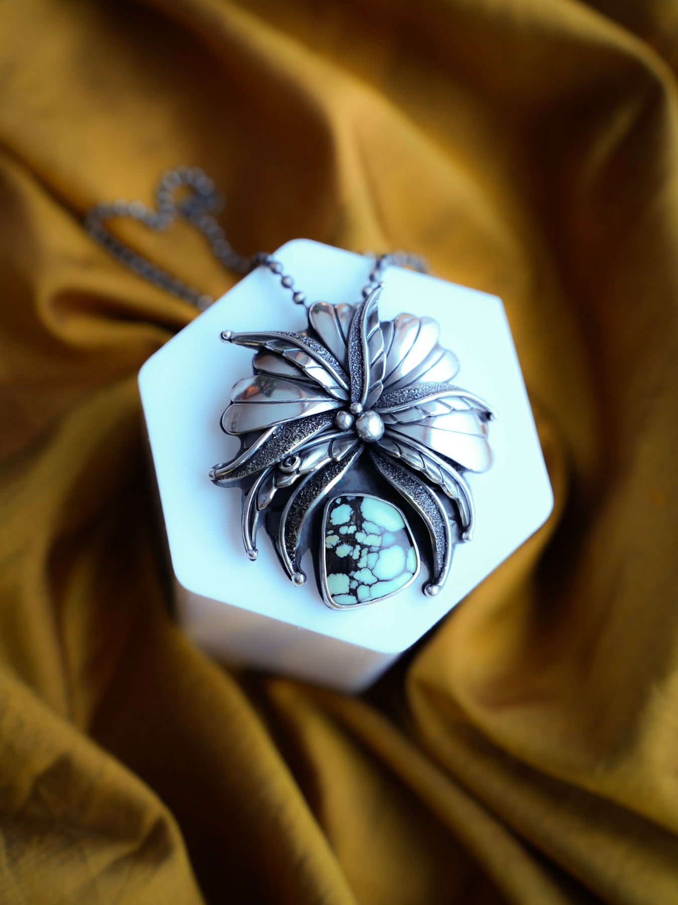 The Becoming is the collection's most intricate statement piece - and it earns every bit of that title. A Desert Bloom Variscite rich with dramatic matrix hangs from the bottom of elaborate sterling silver leafwork, three berry-like drops clustered at the center like seeds waiting to take root. This pendant demands space. It wants to be seen. And it's ready when you are.