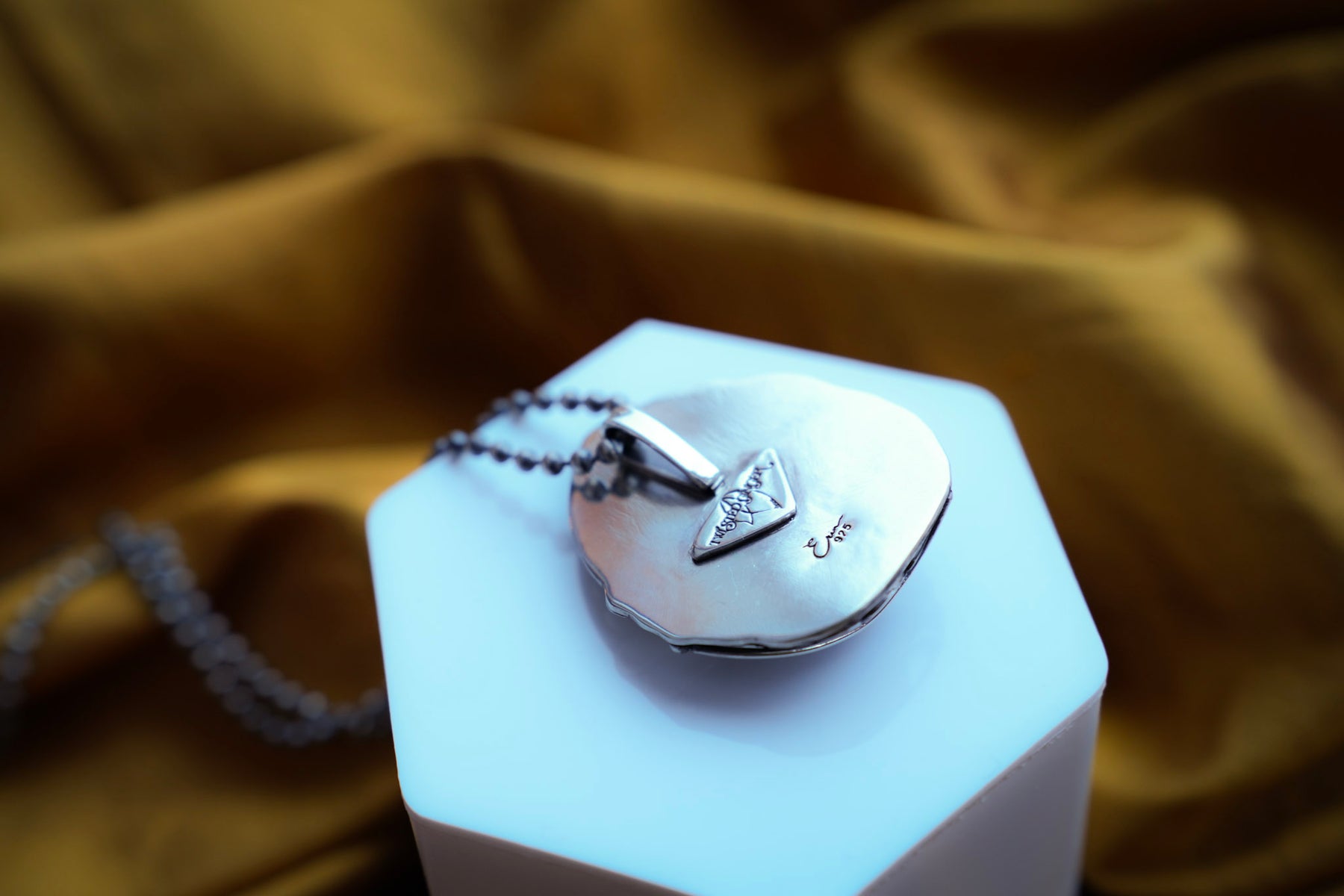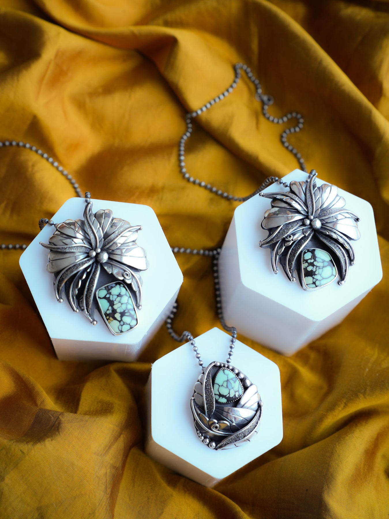 The Threshold features a striking triangle-shaped Desert Bloom Variscite pointing skyward - a stone that knows which direction you're headed even when you don't. The black matrix cuts dramatically through luminous green, framed symmetrically by sterling silver leaves and delicate dewdrops that catch light with every breath.