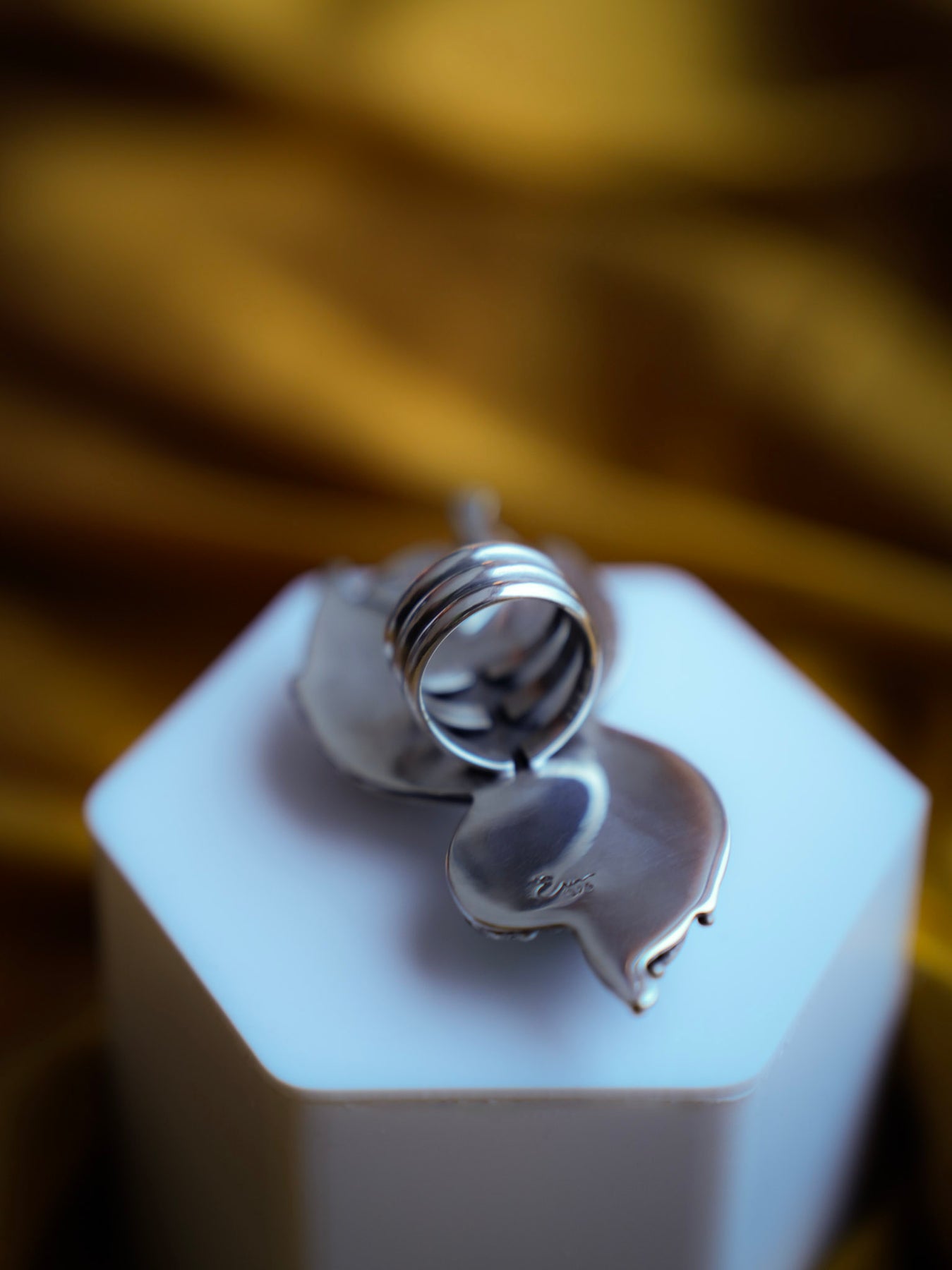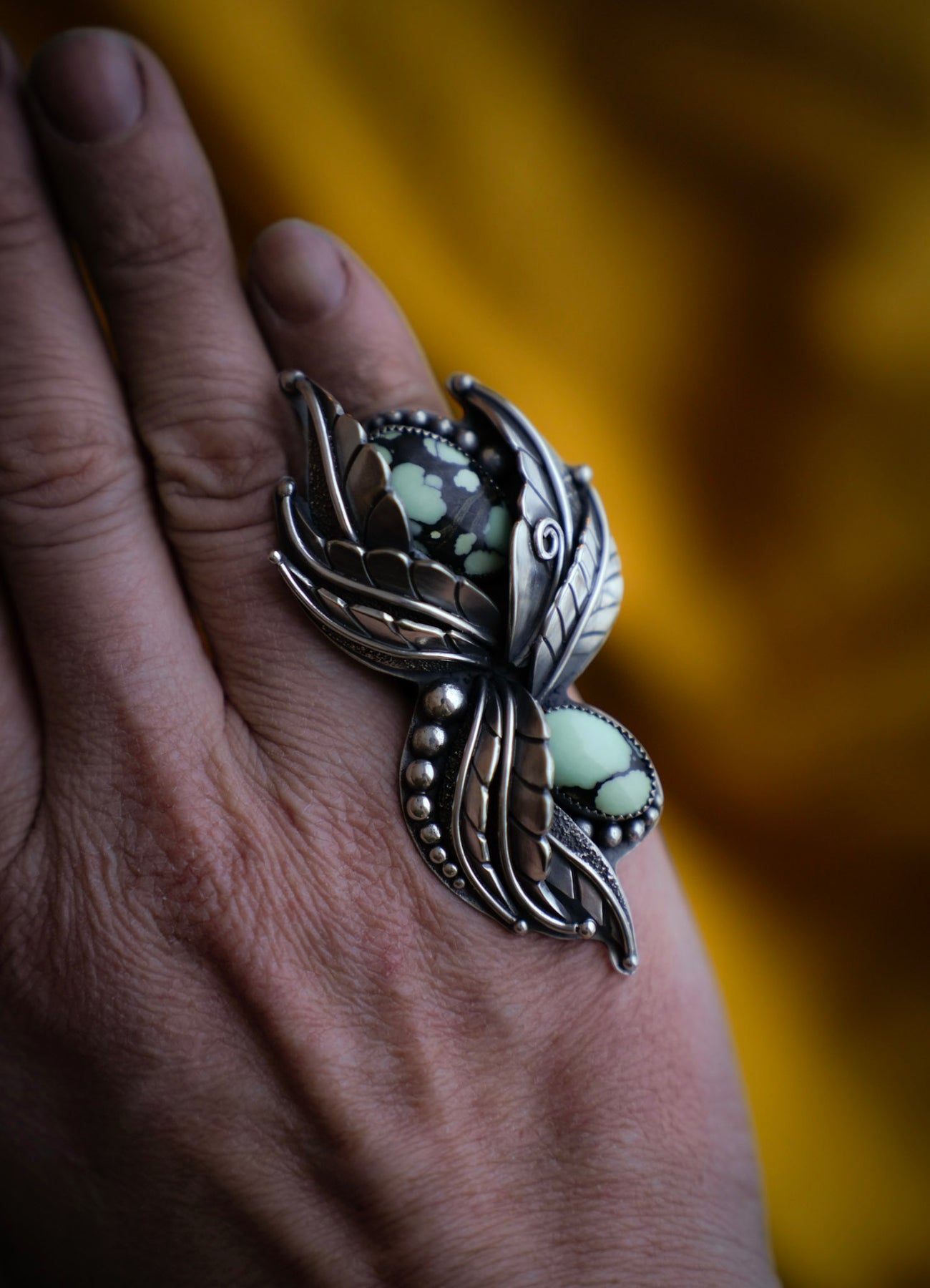 The Fates carries two oval Desert Bloom Variscite stones, each one tucked beneath sterling silver leaves like secrets the forest is keeping. Intricate dewdrops surround each stone, catching light like small prophecies. The leaves don't display the stones - they shelter them. Guard them. Hold them close until the right person comes looking.