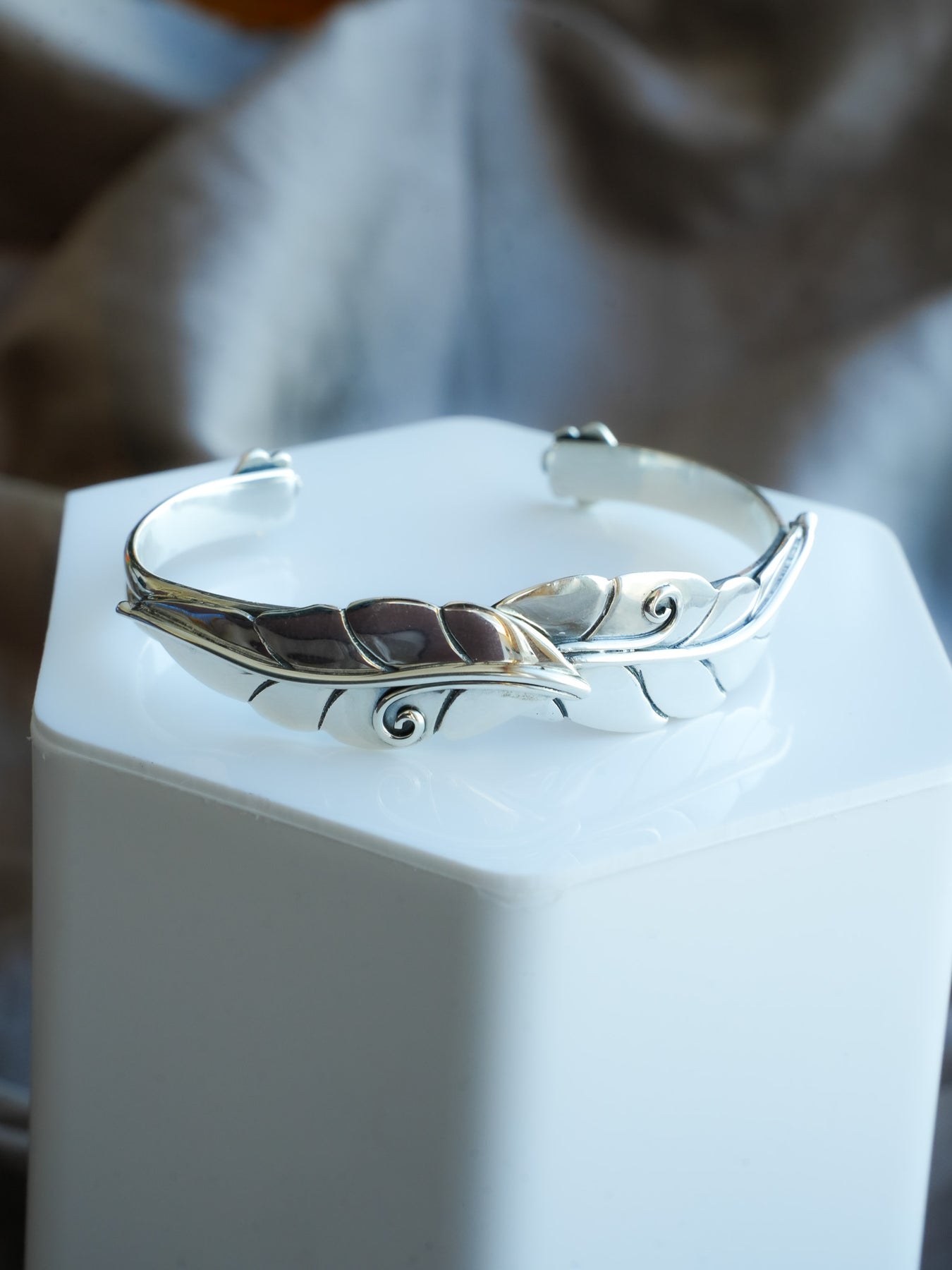 Masterfully handcrafted from premium .925 sterling silver, this graceful cuff features two perfectly formed leaves joined in an eternal dance that subtly evokes the infinity symbol. This thoughtful design represents the endless cycle of nature's seasons and mirrors our personal growth and transformation journey. Each leaf is meticulously positioned to create a harmonious piece that speaks to perfect symmetry and organic movement—a visual meditation on the delicate balance throughout the natural world.