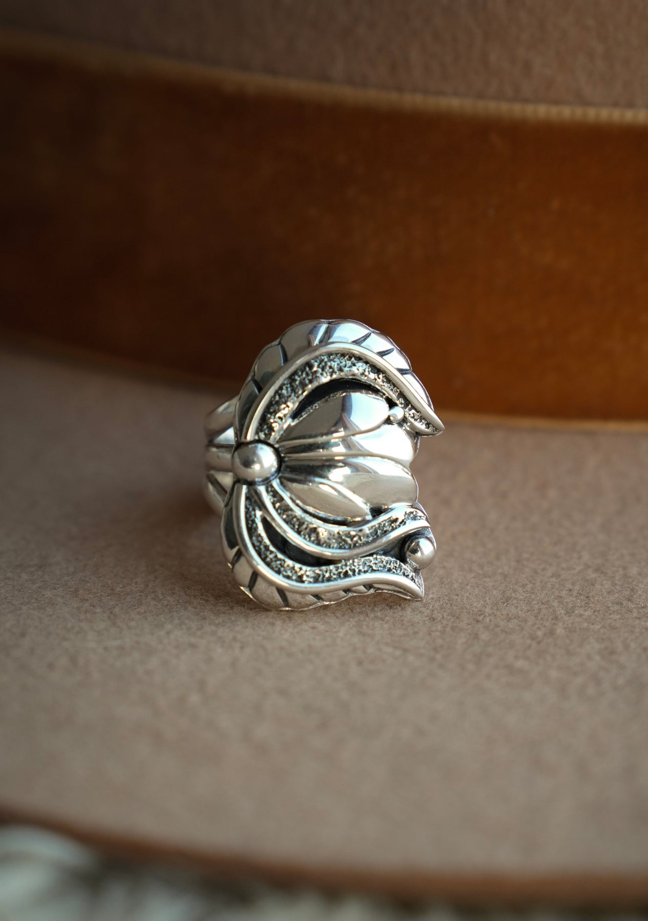 This is the ring for weighted-blanket hands who need to feel their jewelry. The kind of presence that grounds you during big meetings, difficult conversations, moments when you need to remember your own strength. Sterling silver's natural conductive properties amplify this transformative energy. At the same time, the dimensional design creates interplays of light and shadow that shift with every movement—much like dappled sunshine breaking through a forest canopy.