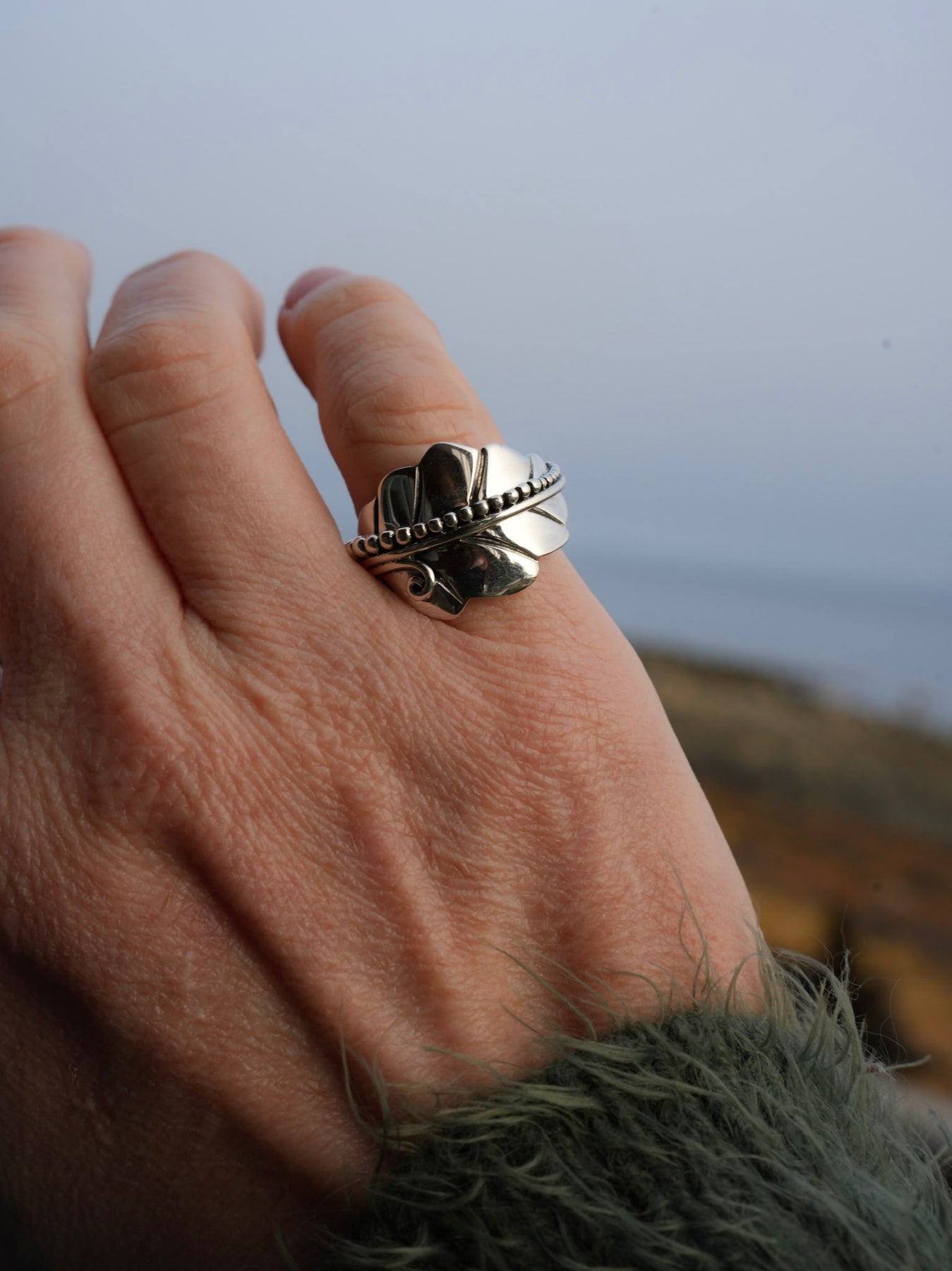 Handcrafted from .925 sterling silver, this ring strikes a balance between detailed beauty and wearable comfort. The granulation work creates a subtle texture you can feel throughout your day, a gentle anchor when your mind races or your hands need something to do. It's meditation you can wear, mindfulness in metal form —a tangible reminder that magic still dwells in untamed places, including within you.