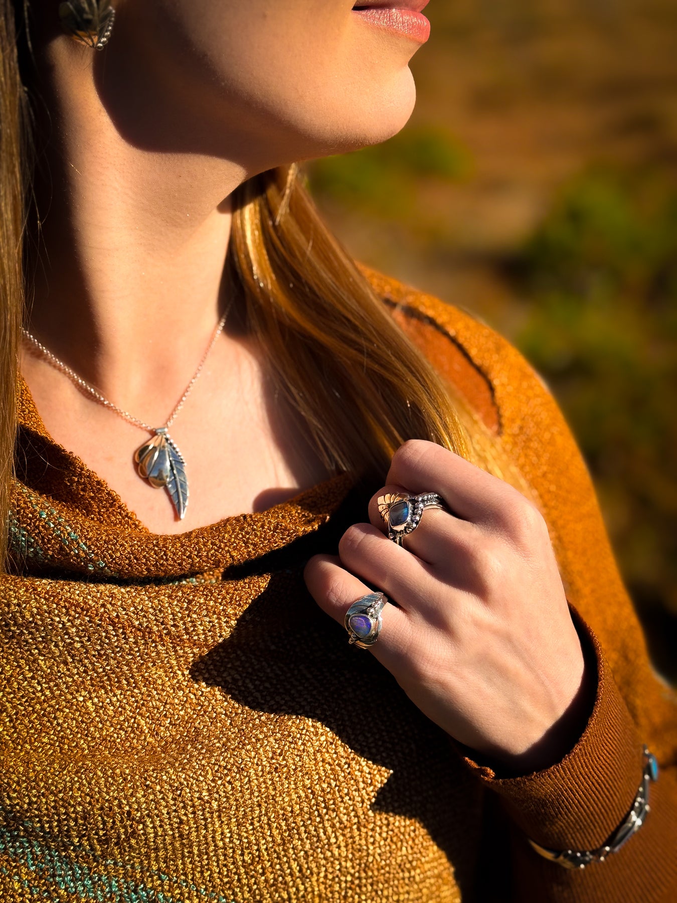 The Dreamweaver setting embraces this transformational energy with 25mm of dramatic sculptural presence across the front—leaves and wings that look like they're forming in real-time, like the moment chaos organizes itself into structure, like matter remembering how to become magic. The substantial 8.7mm back band and 16.6-gram weight give this piece grounding heft—you need stability when you're collapsing into a star. This is jewelry for those brave enough to endure their own becoming.
