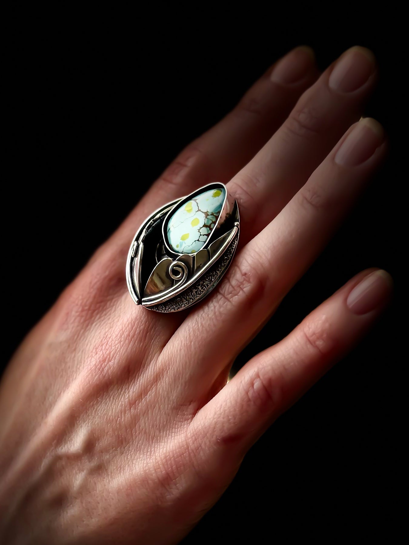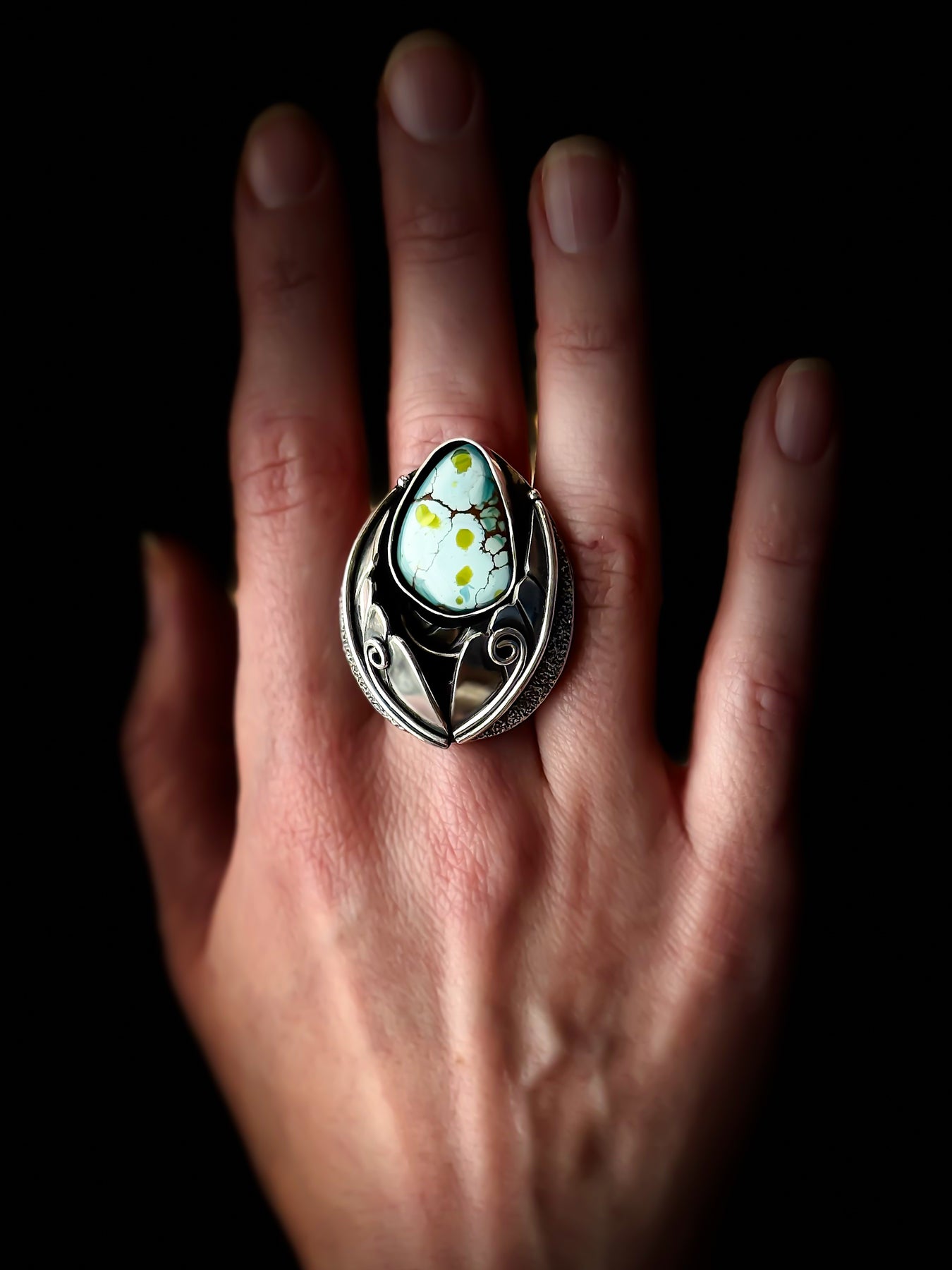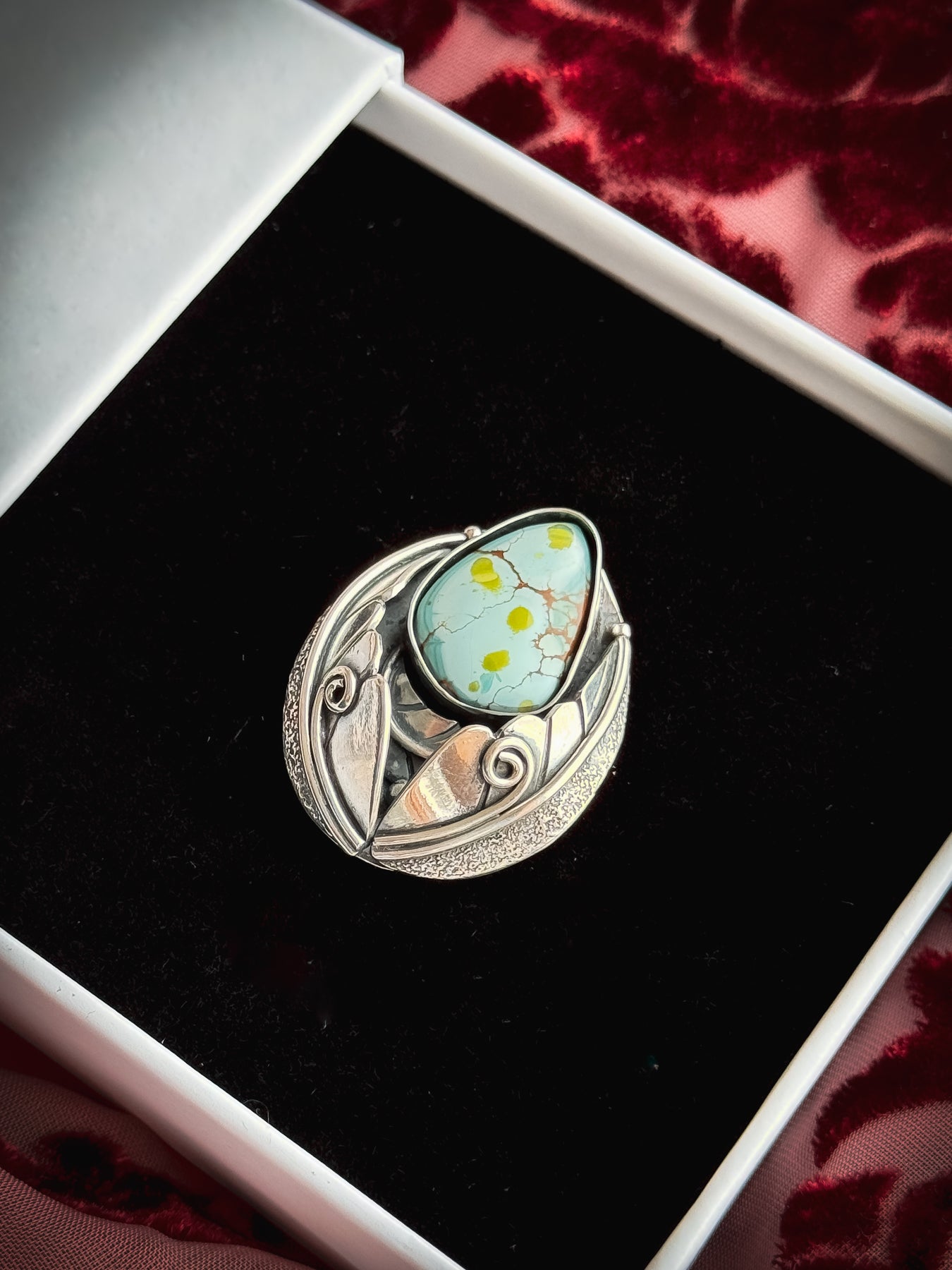 Cradled within rain-kissed silver leaves that dance with protective stardust, this generous teardrop of Gobi Desert Turquoise reveals nature's most lavish gift—five brilliant neon green freckles scattered like emerald constellations across icy white, flowing into celestial icy blues. The light brown matrix weaves through like golden threads, creating a tapestry that speaks of abundance earned through courage to keep your heart open when the world suggests otherwise.