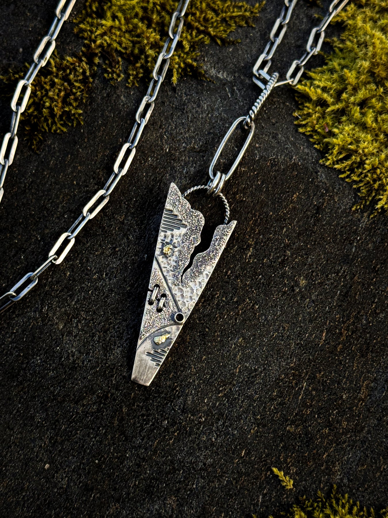 Forge your path to new heights with the Summit pendant, a boldly distinctive piece that captures the untamed spirit of Alaska's majestic mountain ranges. This triangular sterling silver pendant features a dramatic fissure running through its center—a symbolic reminder that strength often emerges from life's deepest challenges.